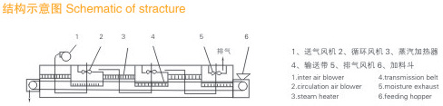 物料由加料器均勻地鋪在網帶上,網帶一般采用12-60目不銹鋼絲網,由傳動裝置拖動在干燥機內移動。干燥機由若干單元組成,每一單元熱風獨立循環,部分尾氣由專門排濕風機排出,廢氣由調節閥控制,熱氣由下往上或由上往下穿過鋪滿物料的網帶完成熱量與質量傳遞的進程,帶走物料水份。網帶緩慢移動,運行速度可根據物料溫度自由調節,干燥后的成品連續落入收料器中。上下循環單元根據用戶需要可靈活配備,單元數量亦可根據需要選取。