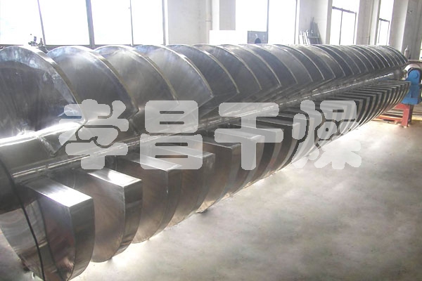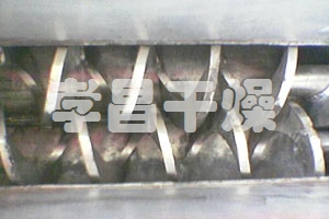 空心軸上密集排列著楔型中空漿葉,熱介質經空心軸流經漿葉。單位有效容積內傳熱面積很大,熱介質溫度從-40℃到320℃,可以是水蒸汽,也可以是液體型:如熱水、導熱油等。間接傳導加熱,沒有攜帶空氣帶走熱量,熱量均用來加熱物料。熱量損失僅為通過器體保溫層向環境的散熱。楔型漿葉傳熱面具有自清潔功能。物料顆粒與楔型面的相對運動產生洗刷作用,能夠洗刷掉楔型面上附著物料,使運轉中一直保持著清潔的傳熱面。漿葉干燥機的殼體為Ω型,殼體內一般安排二到四根空心攪拌軸。殼體有密封端蓋與上蓋,防止物料粉塵外泄而充分發揮作用。